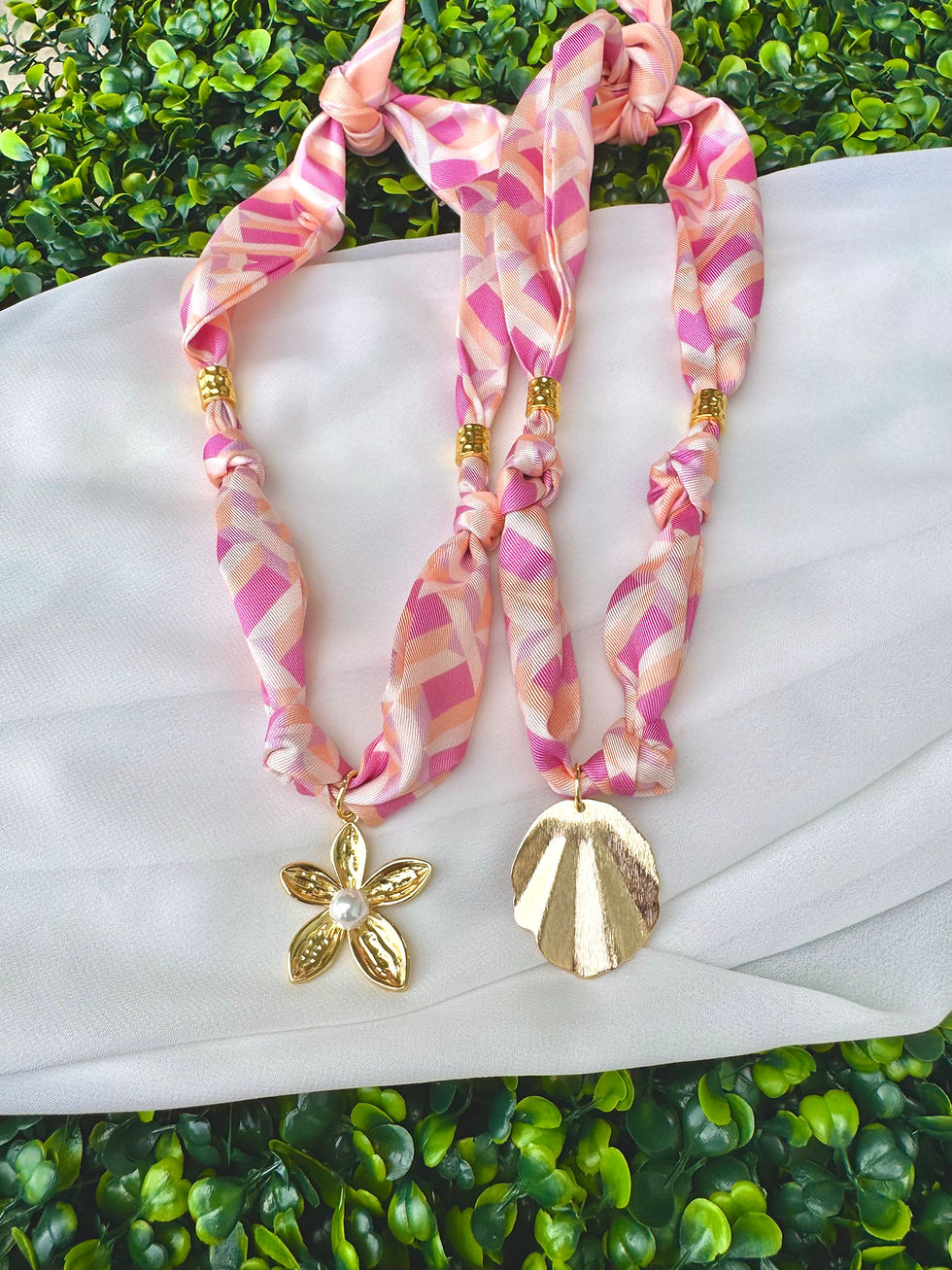 Teal/Pink Print Scarf Necklace with Golden Wheel